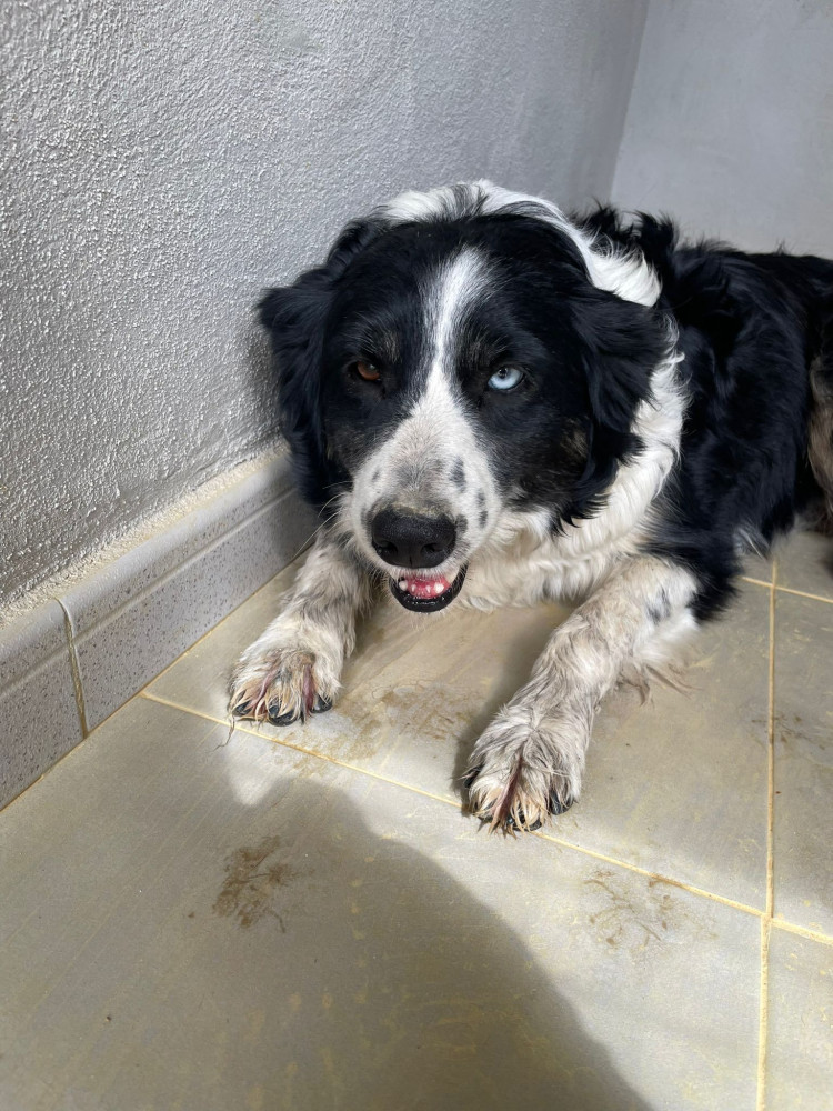 Esta preciosidad es DAFNE, una perrita que los vecinos llevaban tiempo alimentando hasta que la hemos podido coger. Es una hembra de Border Collie y tiene 6 años. Hhoy está a salvo... pero le falta lo más importante: una familia que la ame.